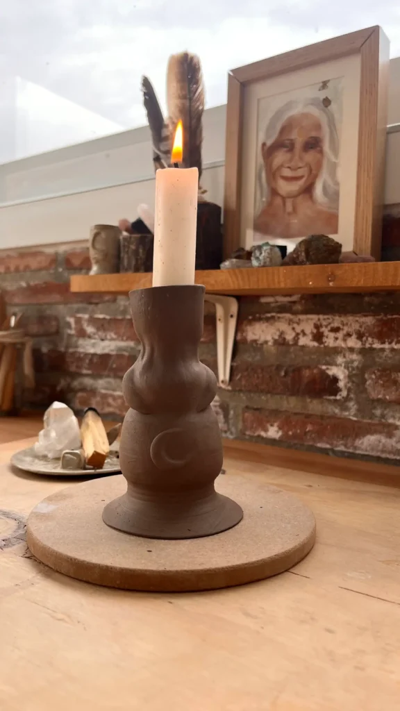Tallados con símbolos, lunas o motivos naturales, estos portavelas invitan a contemplar la