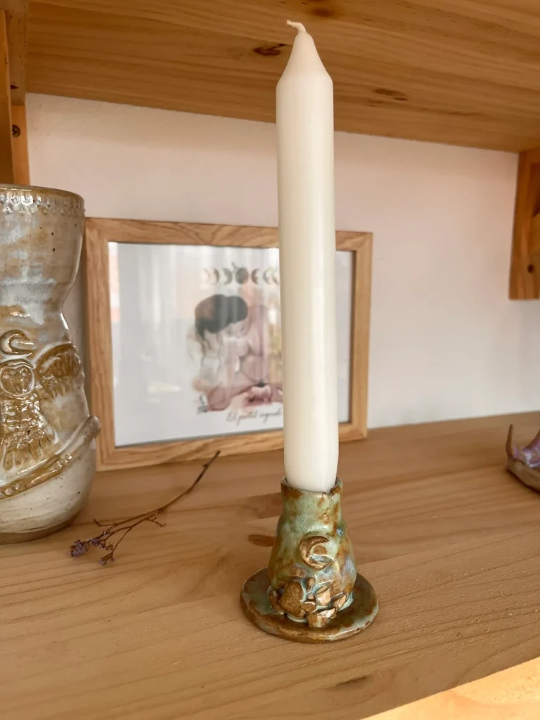 Tallados con símbolos, lunas o motivos naturales, estos portavelas invitan a contemplar la