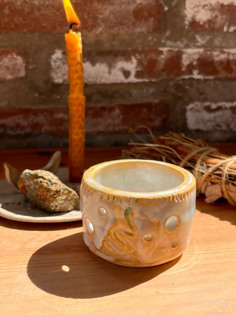 Tallados con símbolos, lunas o motivos naturales, estos portavelas invitan a contemplar la