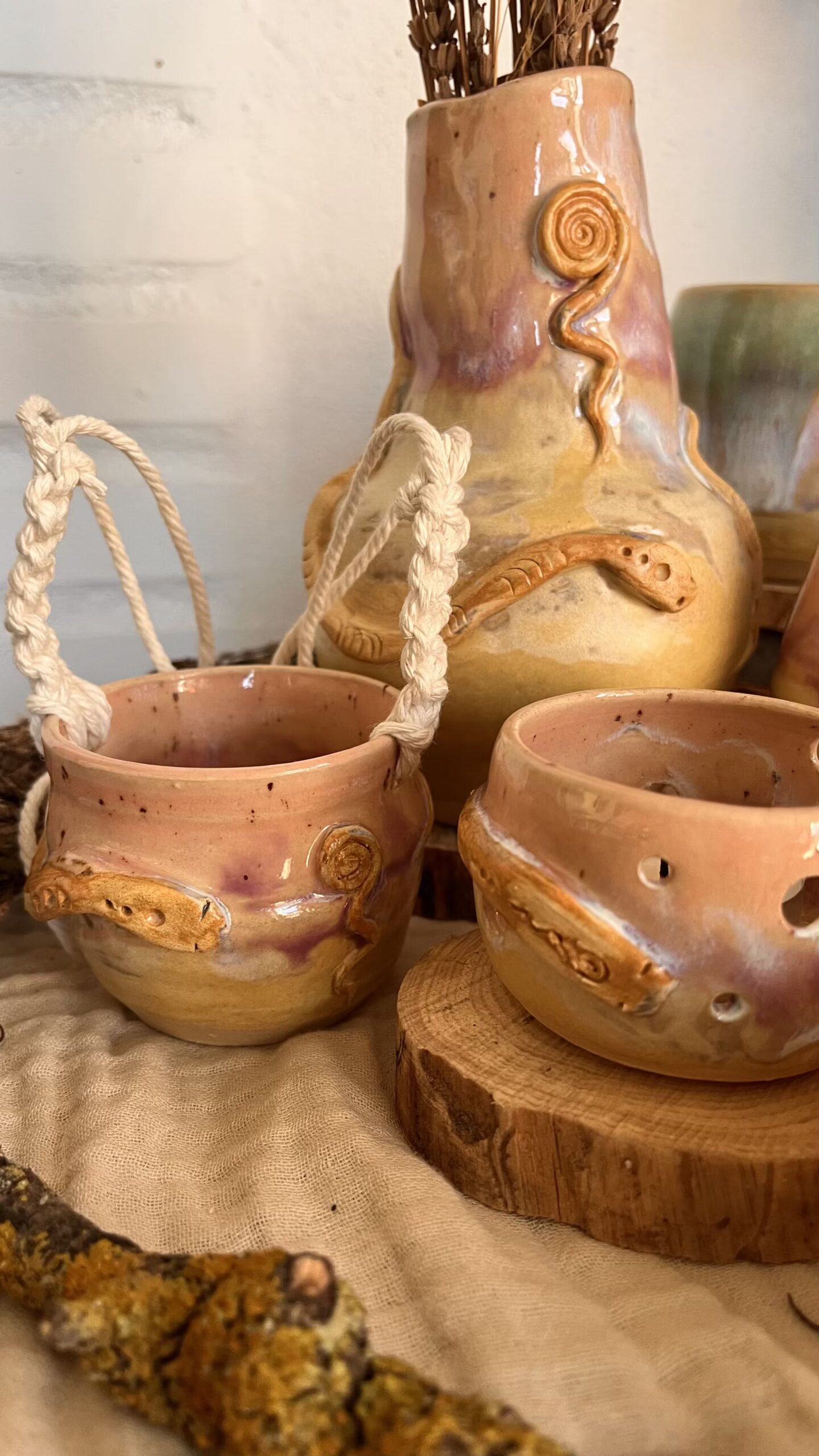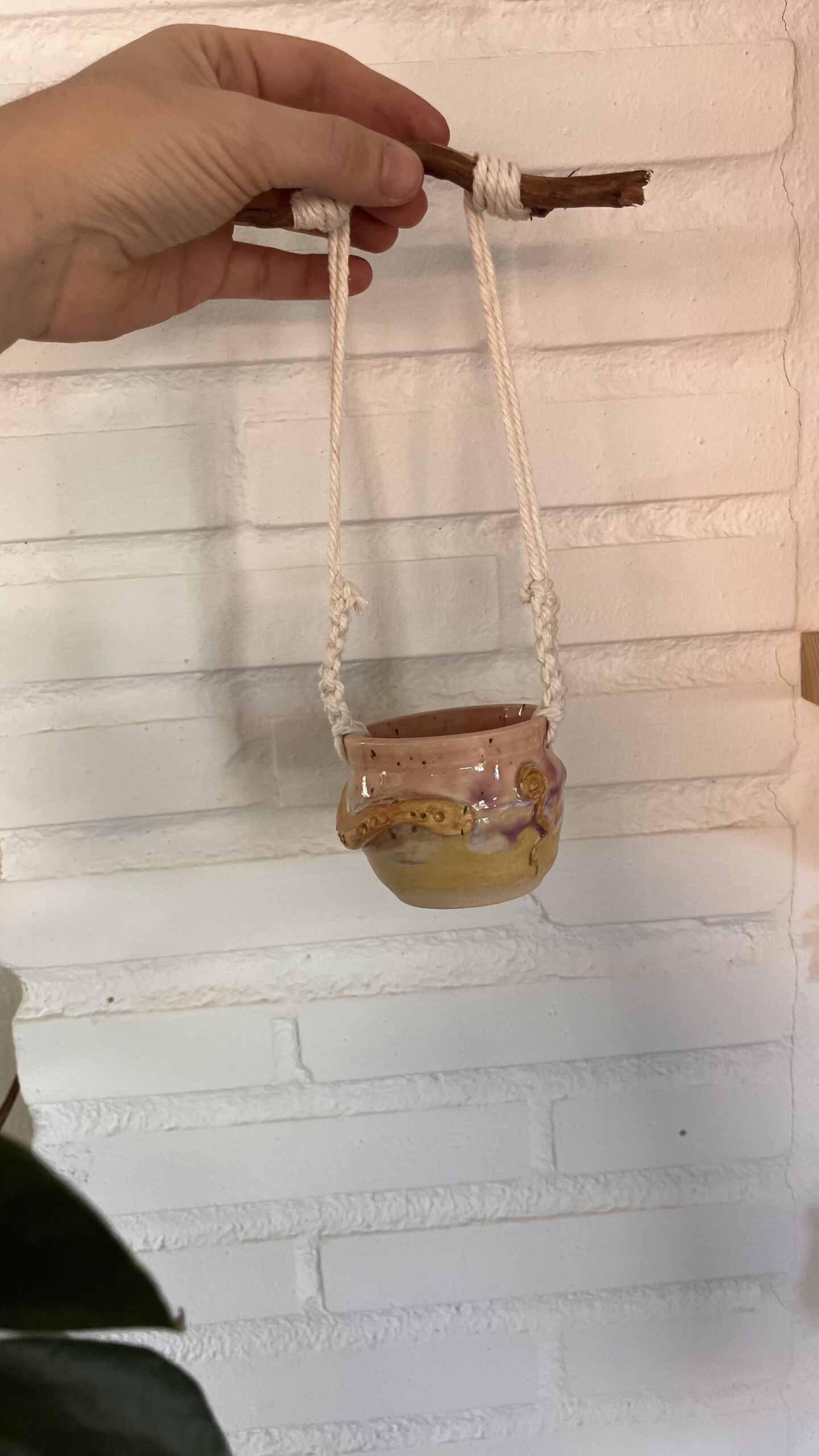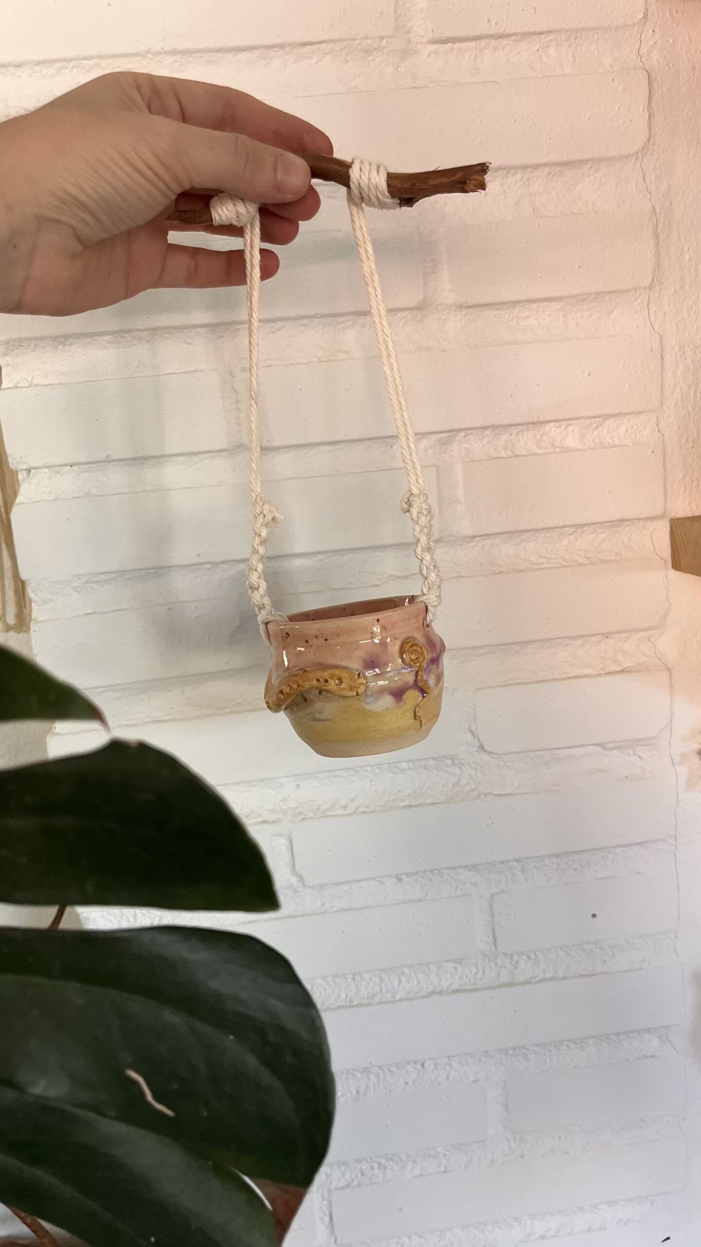 Trenzada en macramé y coronada con un asa de madera natural, es una pieza que invita a tocar, sostener y recorrer con la mirada sus formas y texturas.