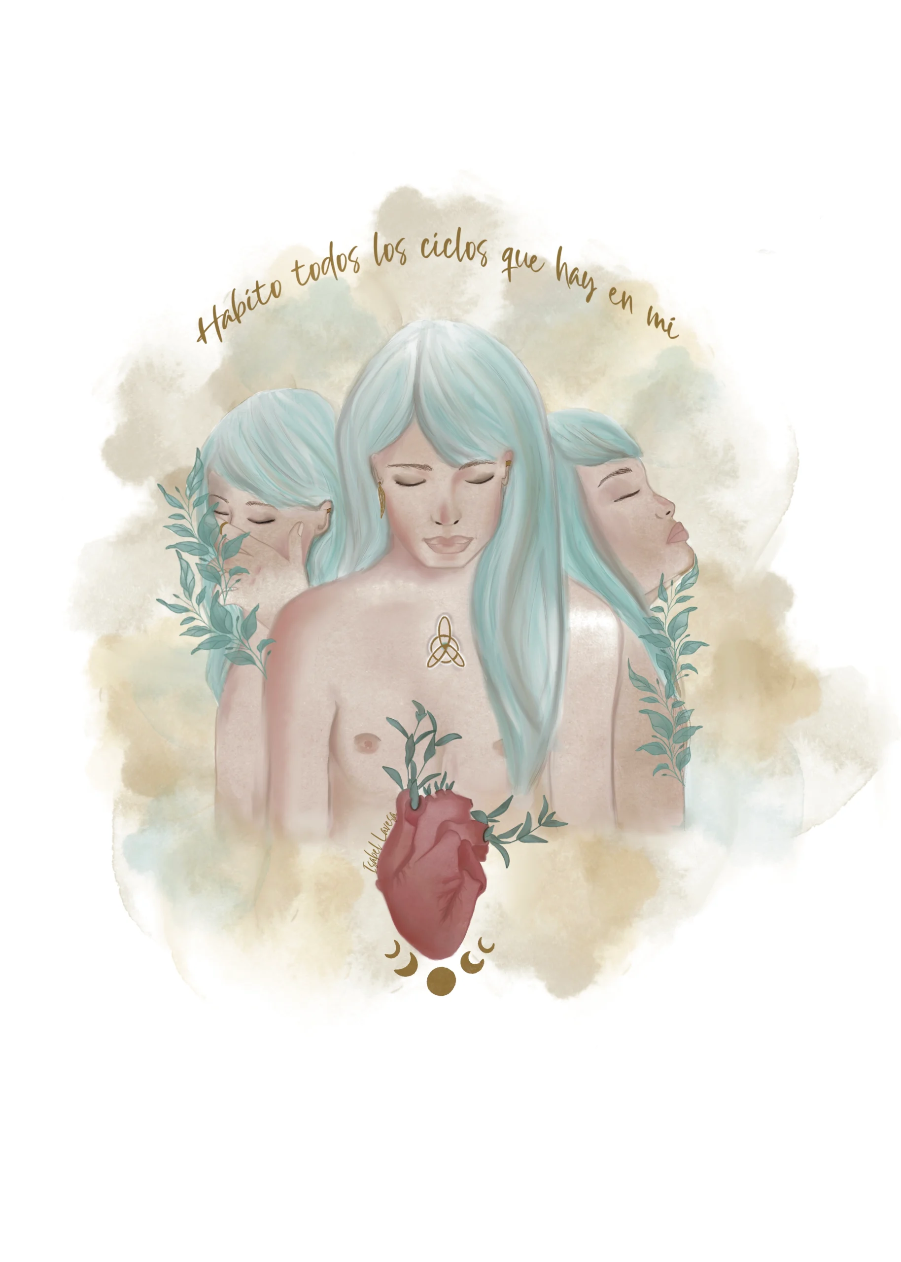 La ilustración celebra la ciclicidad: la capacidad de atravesar sombras y de acoger luces, de reconocer que cada fase tiene su sentido y su belleza. Habitar los ciclos es aceptar la transformación constante, el fluir de lo interno, y sostenernos con ternura en cada etapa.
