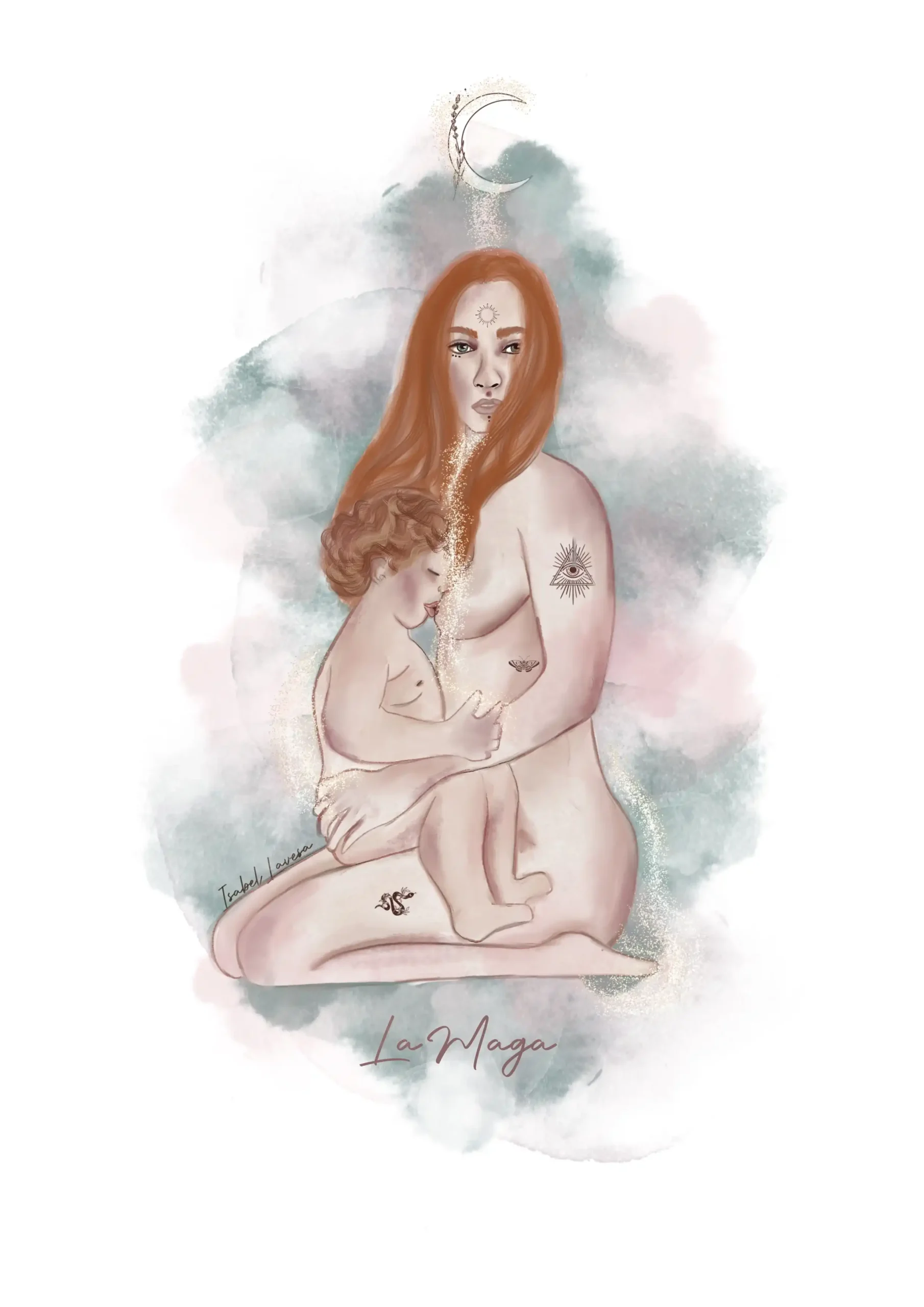 La Maga representa la fuerza del poder femenino en su forma más sagrada: la capacidad de nutrir, sostener y proteger. En la ilustración, una mujer amamanta a su hijo, un gesto que simboliza el cuidado, la entrega y la conexión profunda con la vida.
