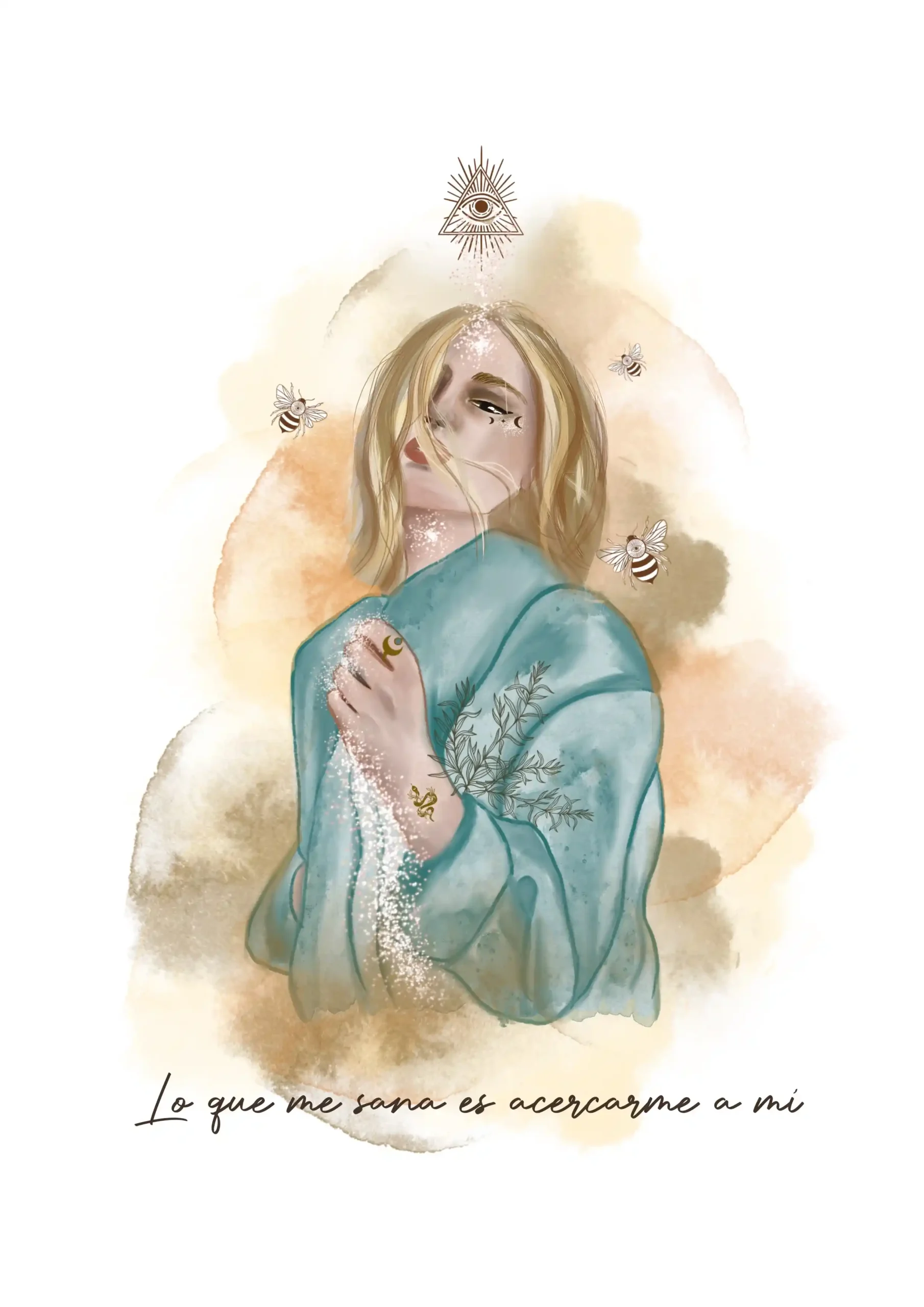 Esta ilustración habla de la valía y del reconocimiento que nace desde dentro. Es un recordatorio de que sanar y encontrarnos no depende de otros, sino de acercarnos a nuestra propia esencia, a nuestra raíz.