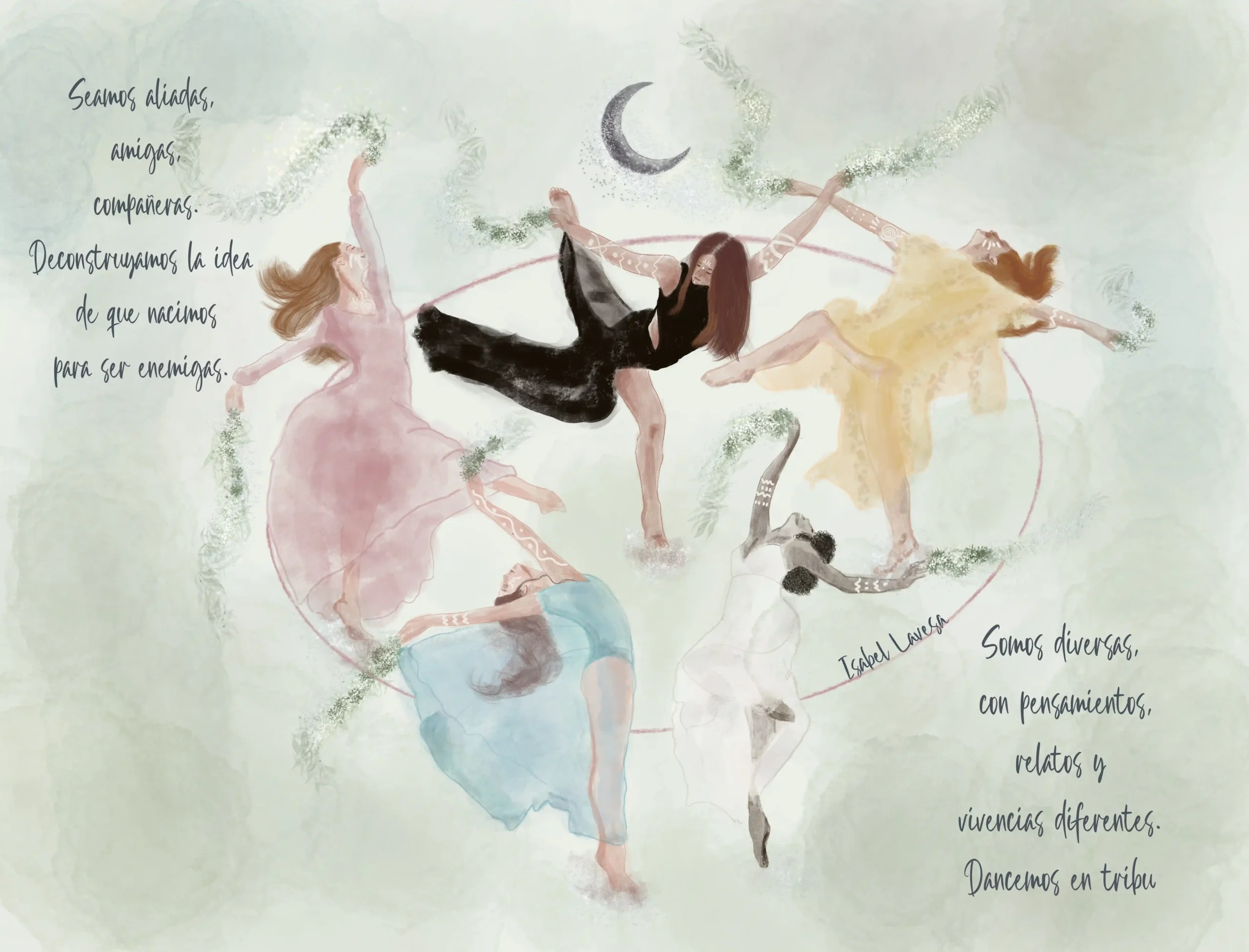 Celebra la hermandad y el gozo compartido. Mujeres que se mueven juntas, sosteniéndose y acompañándose, recordando que nuestras diferencias no nos separan, sino que nos enriquecen.