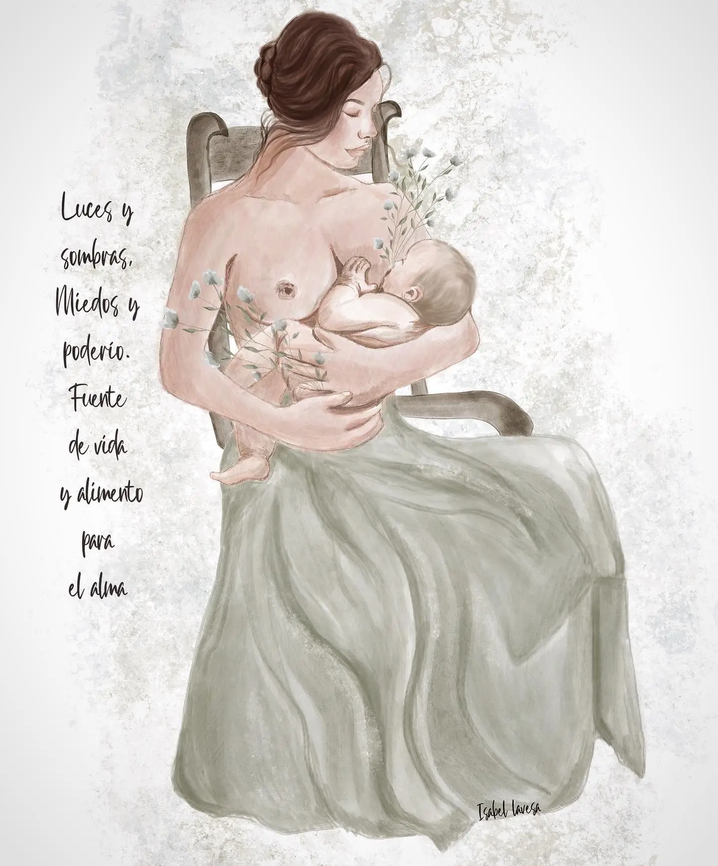 La ilustración invita a contemplar la maravilla de este acto cotidiano y sagrado: nutrir, cuidar, ofrecerse y honrar la fuerza y la ternura que conviven en nosotras, en cada instante de amor que damos y recibimos.