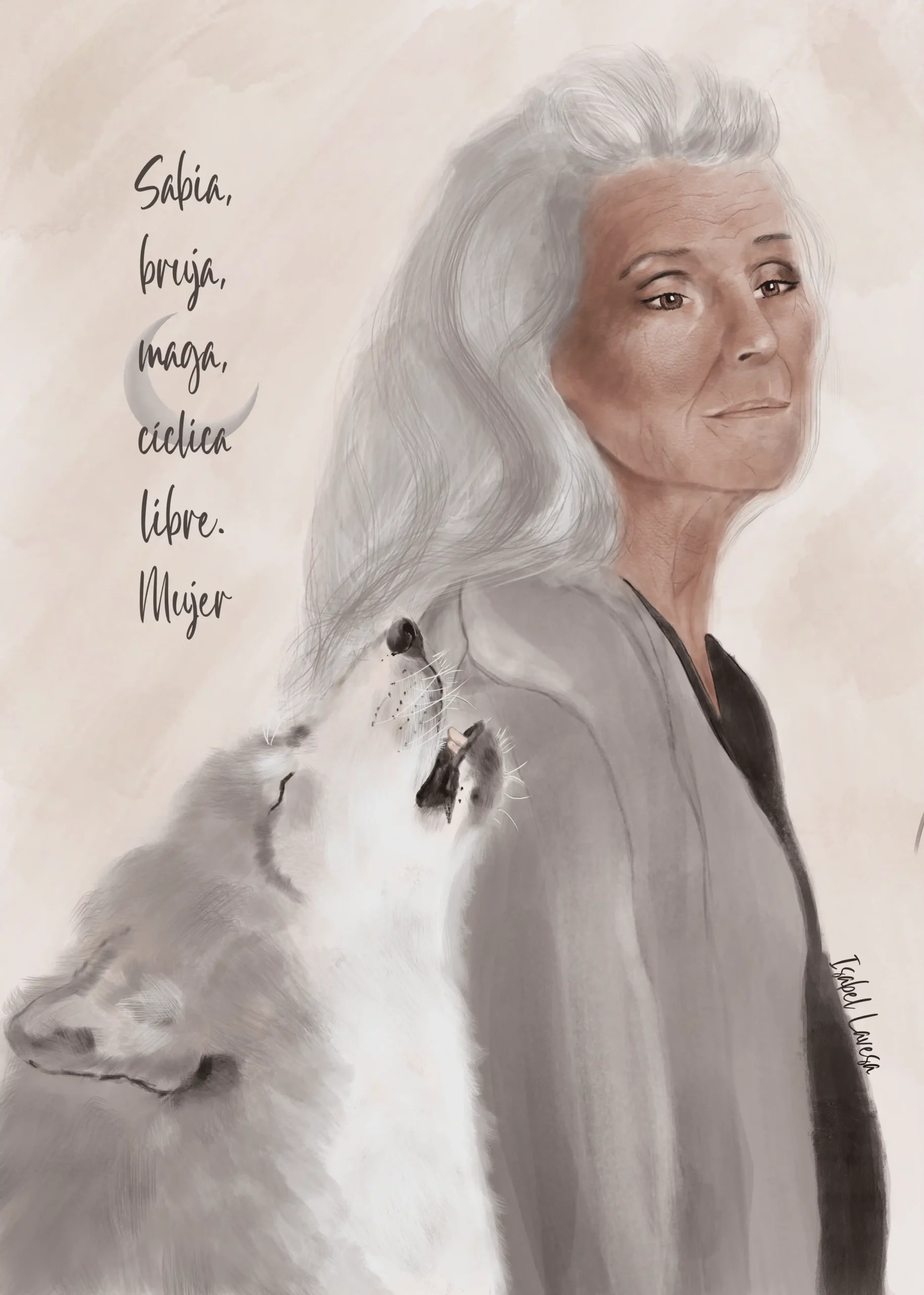 La mujer encarna la sabiduría que surge al reconocerse cíclica, mágica y poderosa. La loba, compañera silenciosa, recuerda la conexión con nuestra propia naturaleza salvaje, con el instinto y la fuerza que siempre nos acompaña.