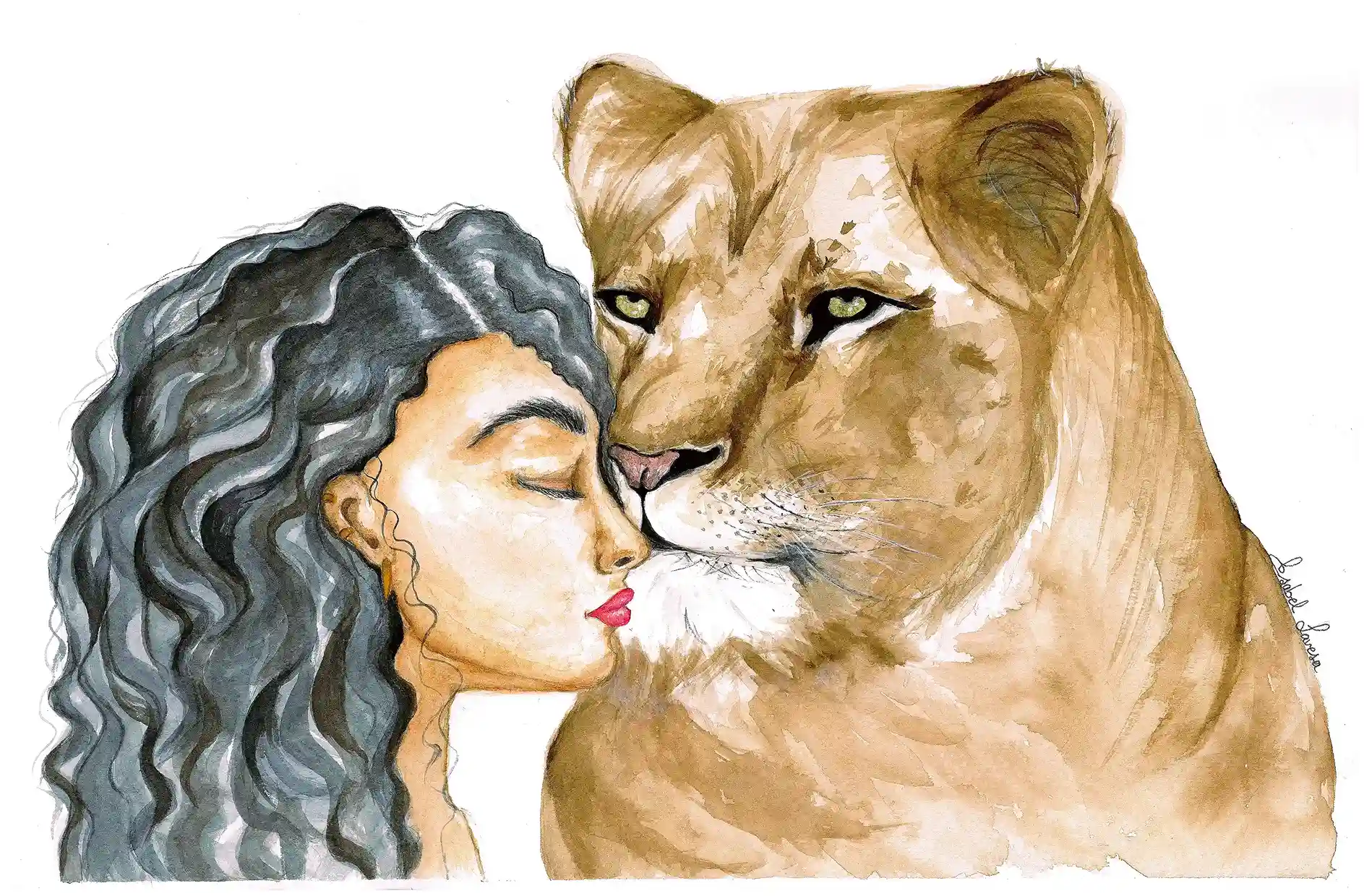 En esta ilustración, una mujer y una leona se encuentran sin miedo. No hay jerarquía, no hay distancia: solo el reconocimiento profundo entre dos formas de la misma energía. Se acarician mutuamente como quien recuerda su origen —un lenguaje antiguo donde el cuerpo sabe antes que la mente.