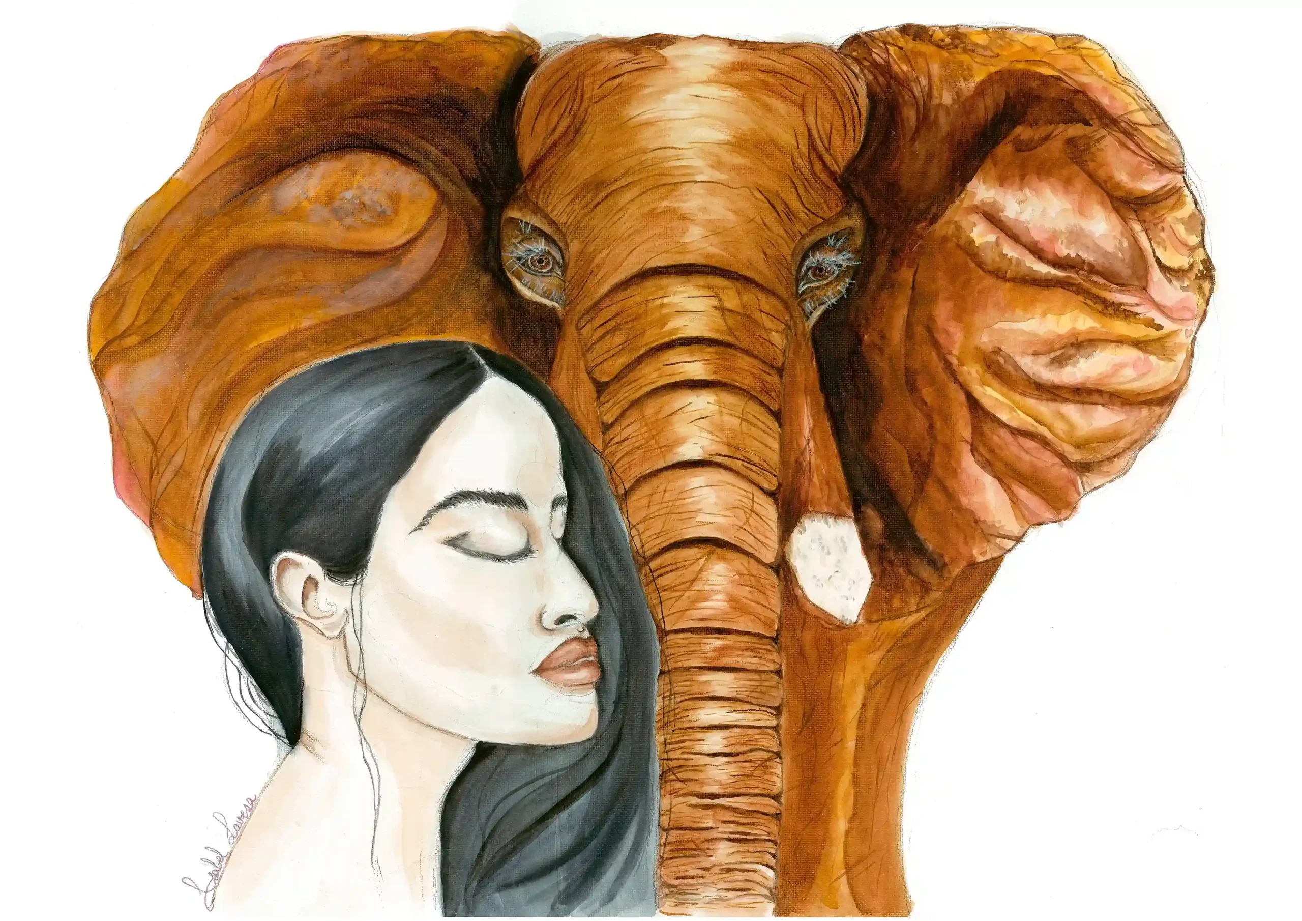 La mujer encarna la protección de su cultura, su identidad y su convivencia con el mundo natural. Su presencia junto al elefante refleja un equilibrio consciente: la armonía que surge cuando se honra la vida en todas sus formas y se reconoce la sabiduría de quienes nos