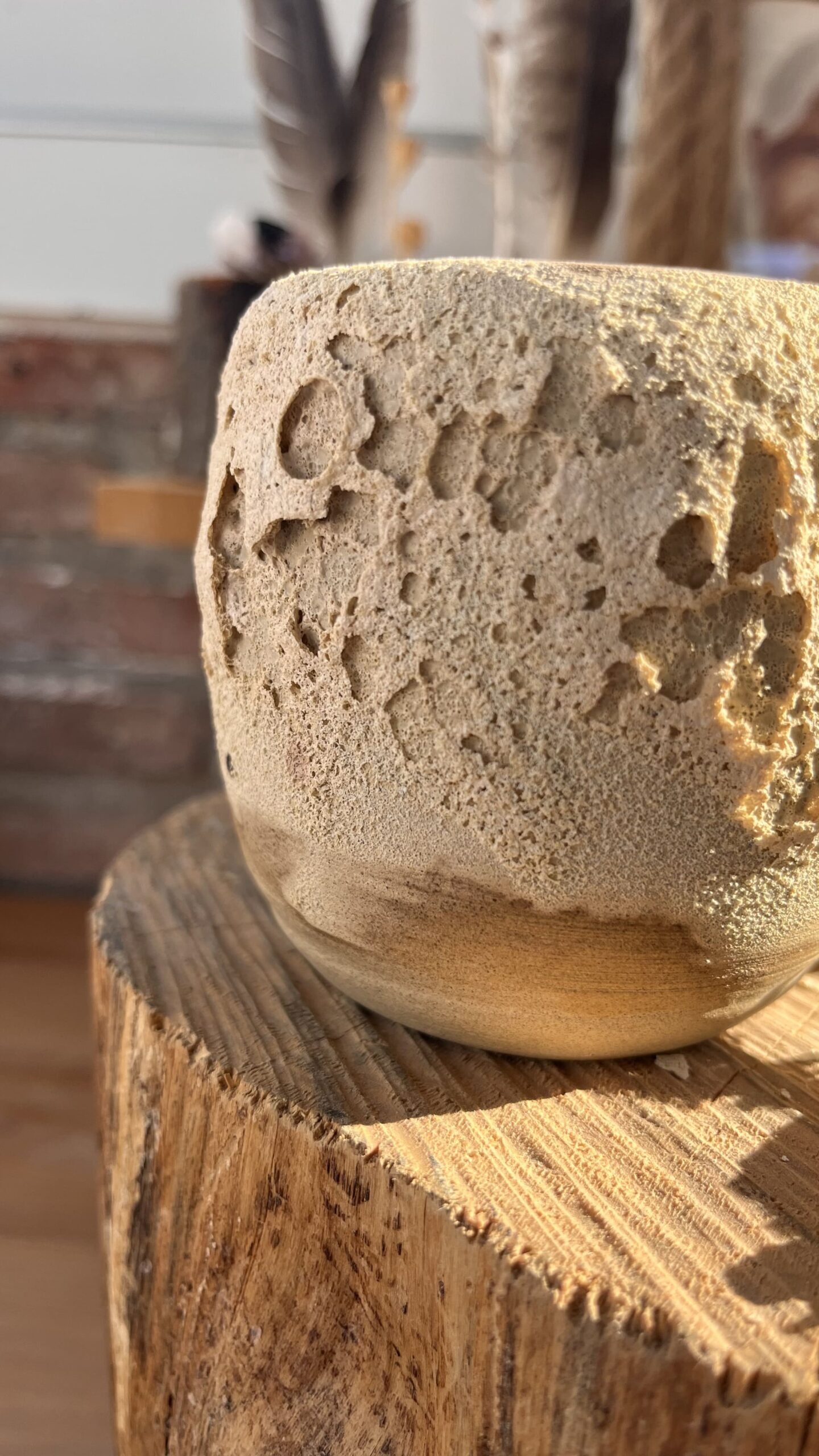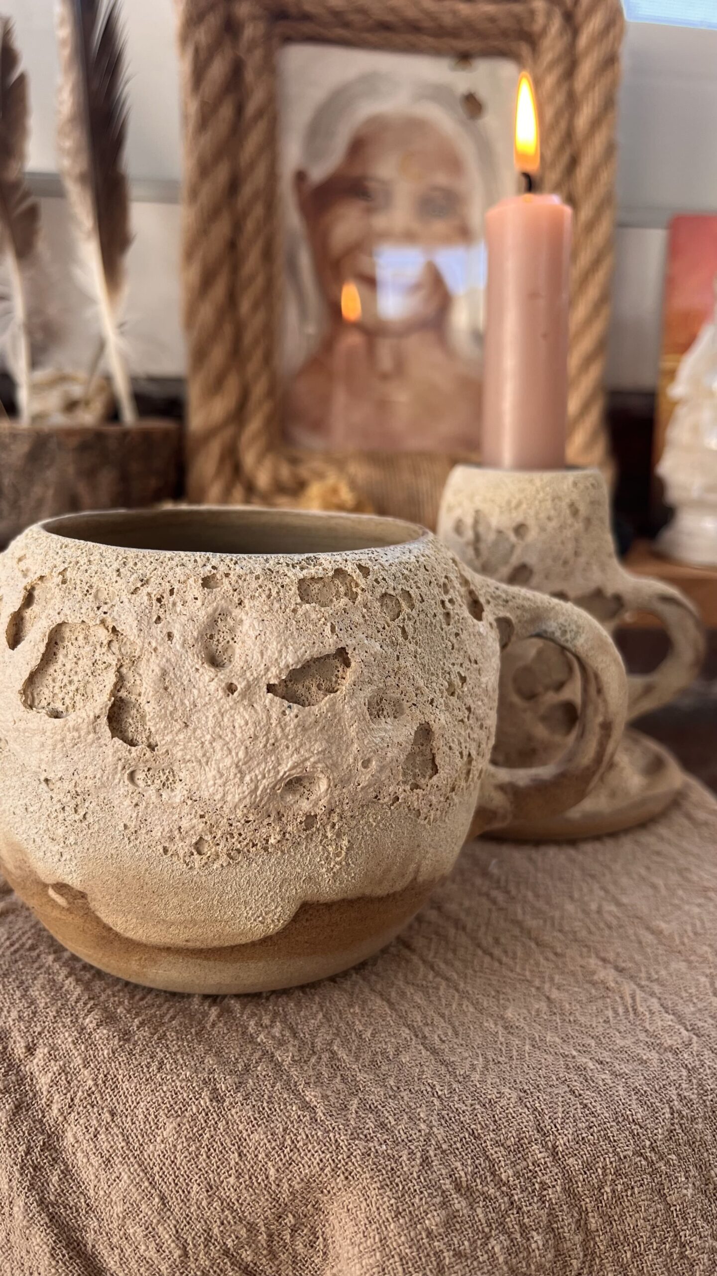 Su textura rugosa despierta los sentidos, como si las manos recorrieran los relieves lunares.