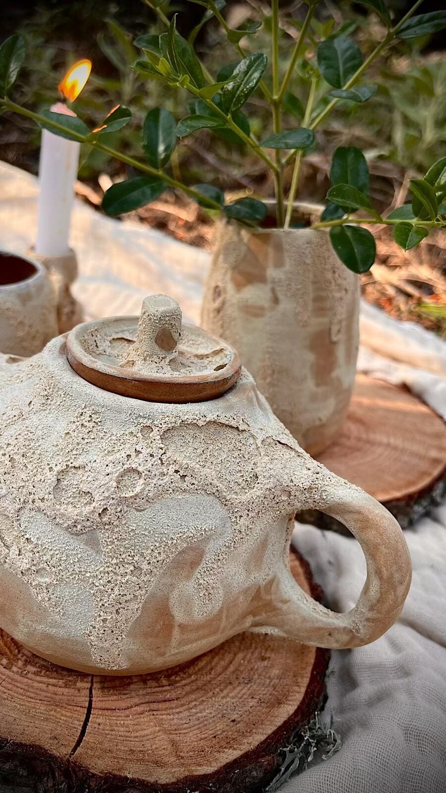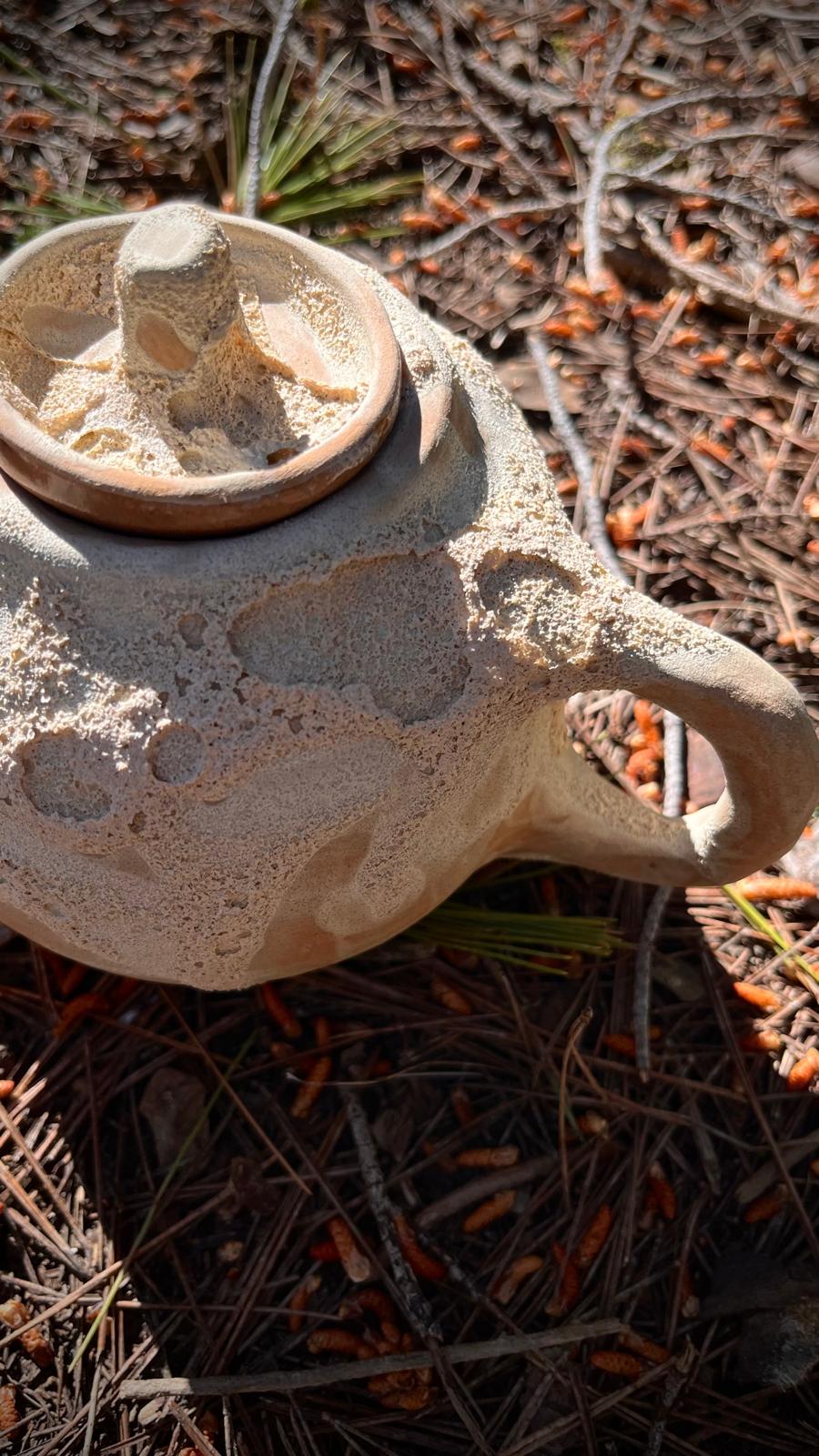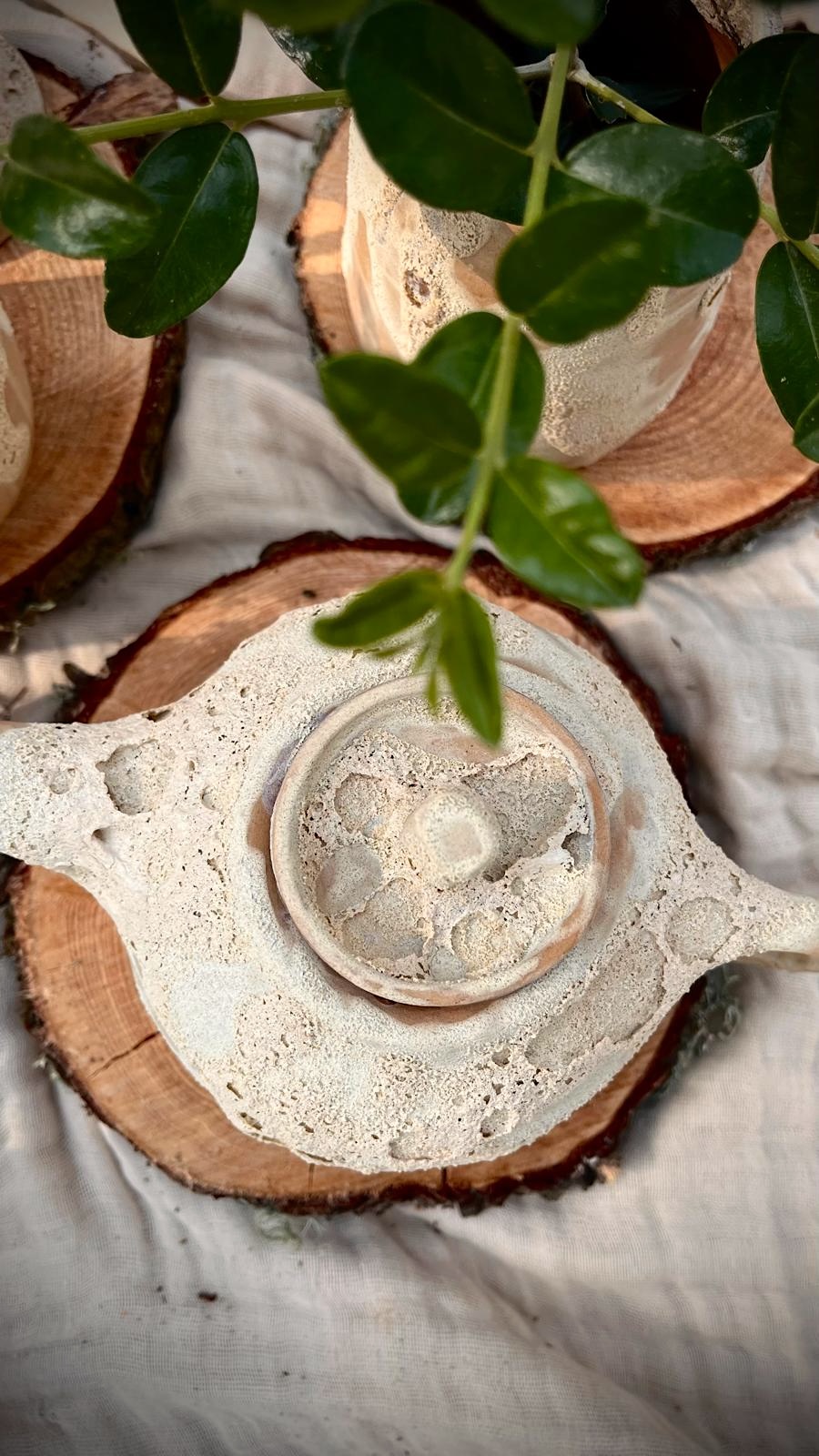 Su superficie, marcada por una textura lunar, guarda pequeños relieves que recuerdan a los cráteres, a los paisajes que solo se revelan cuando la luz los roza. Los tonos blancos y terrosos se funden como si la tierra y el cielo se hubieran encontrado en un mismo gesto.