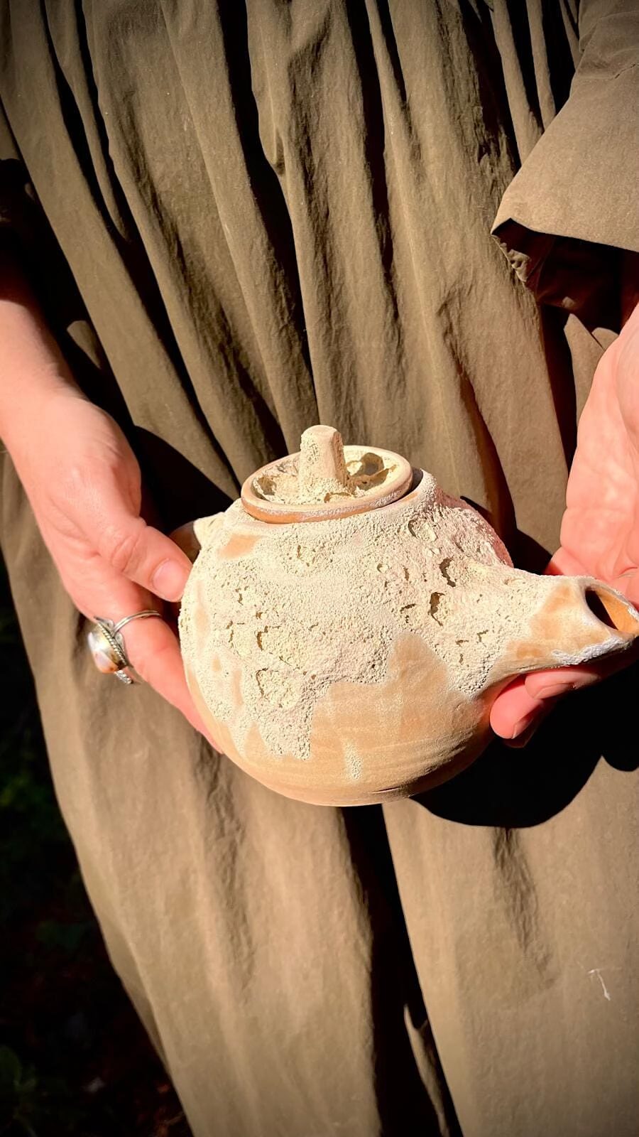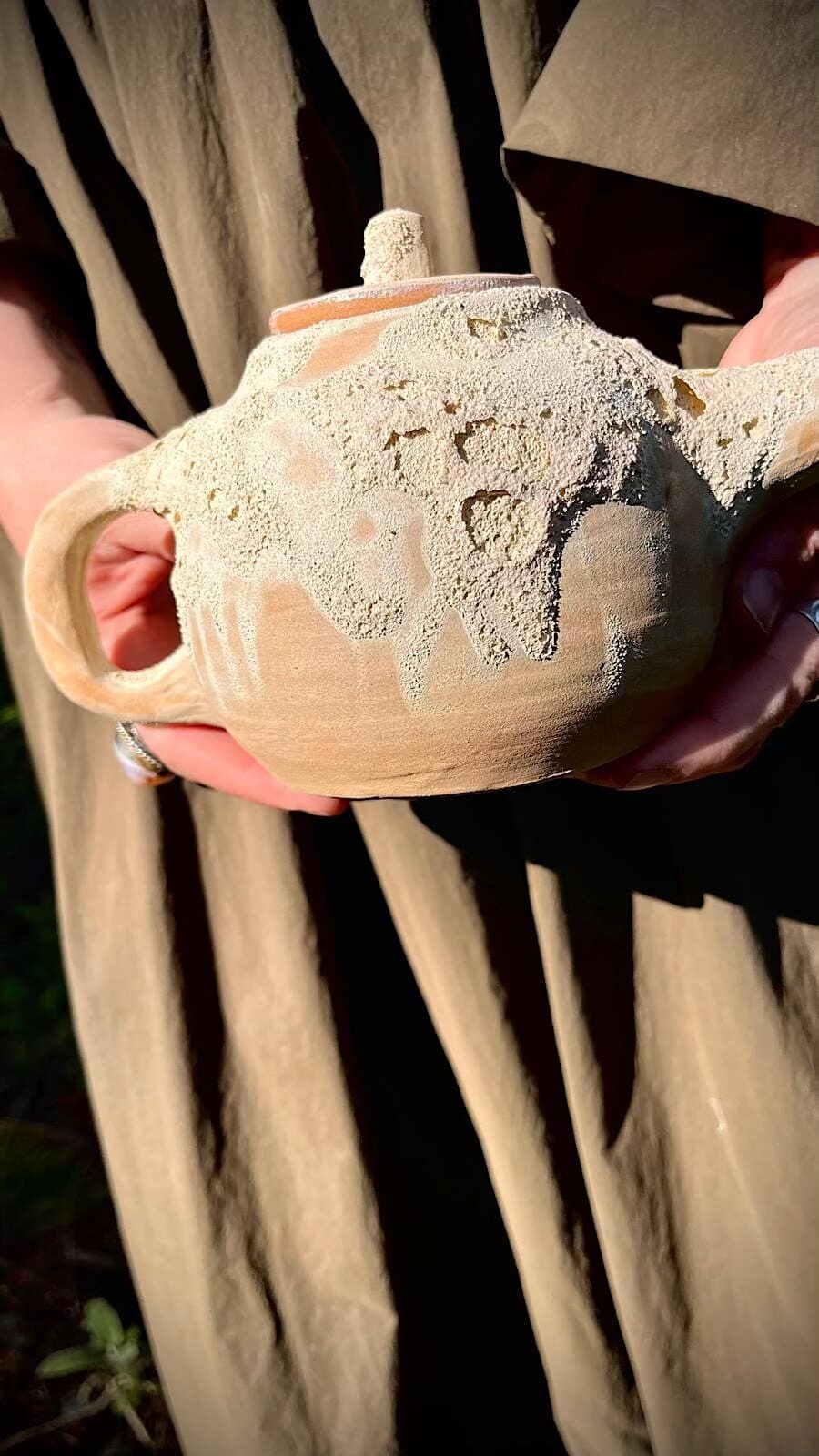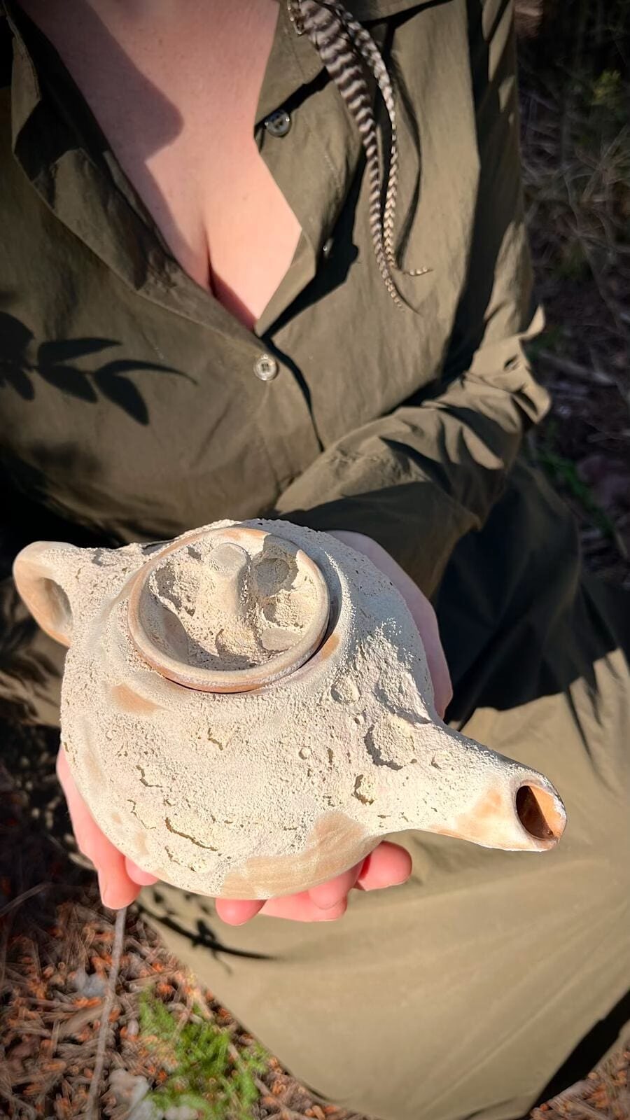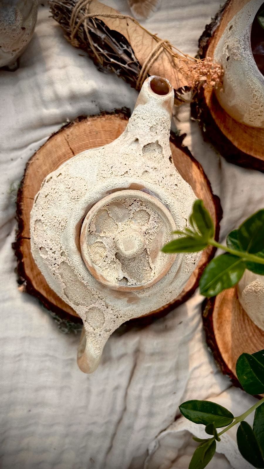 Su superficie, marcada por una textura lunar, guarda pequeños relieves que recuerdan a los cráteres, a los paisajes que solo se revelan cuando la luz los roza. Los tonos blancos y terrosos se funden como si la tierra y el cielo se hubieran encontrado en un mismo gesto.
